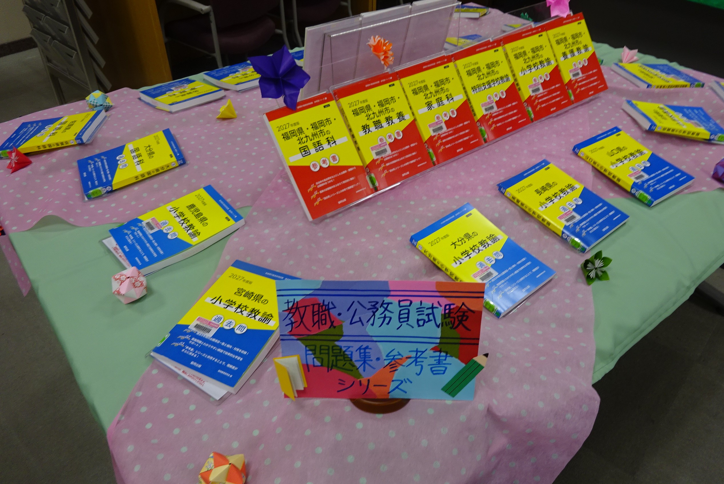 今回、福岡県をはじめ九州各県の教職・公務員試験に関する問題集および参考書をコーナー展示しています。就職活動中の学生さんはもちろん、入学したばかりの学生さんも、興味がありましたらいちど手に取ってご覧いただけますと幸いです。